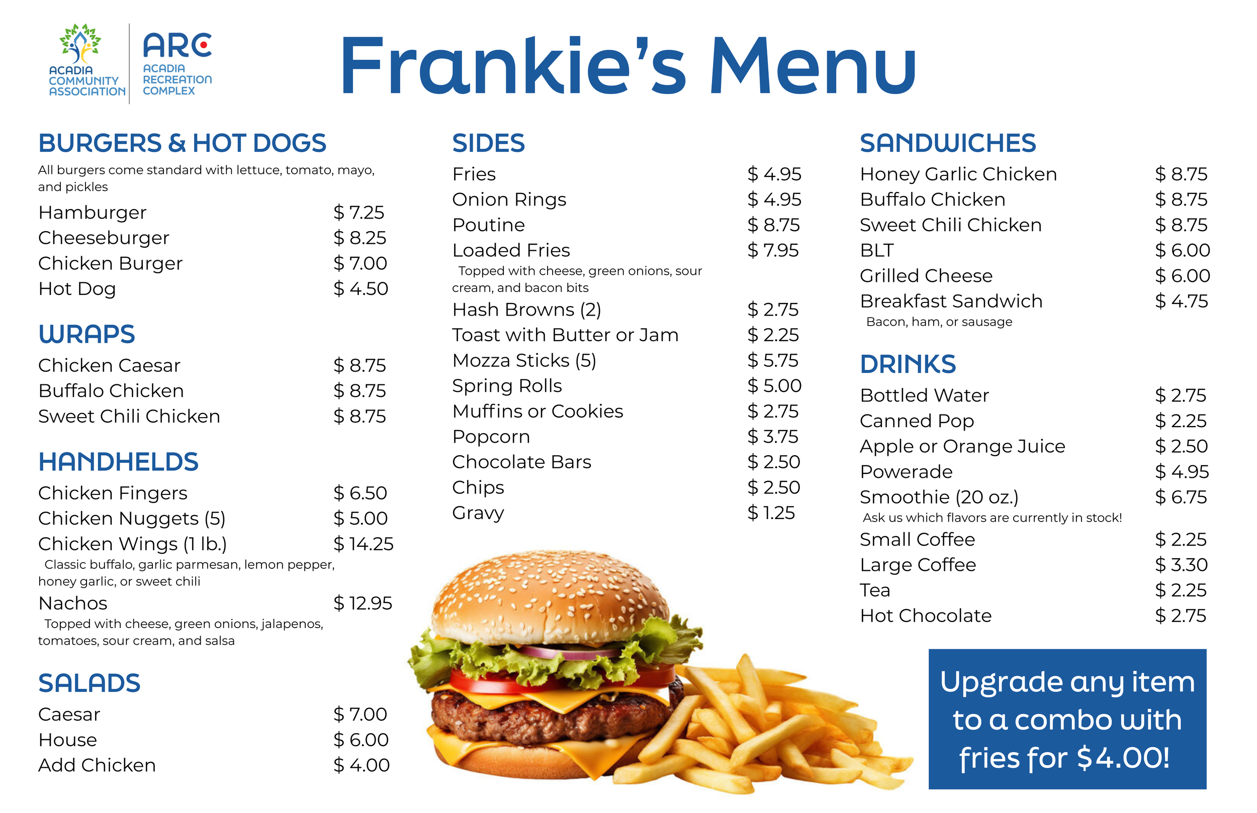 Frankie’s will be open with modified hours in the off-season. Check back for more details. For more information on upcoming events at the ARC, check out our event page!